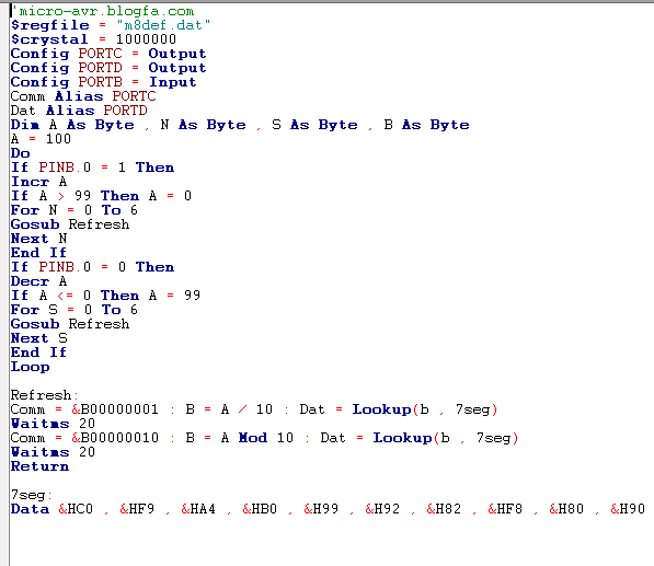 عملکرد مدار به این ترتیب است که اگر کلید متصل به پین B.0 صفر باشد شمارنده نزولی و اگر یک باشد شمارنده به صورت صعودی از صفر تا 99 میشمارد.