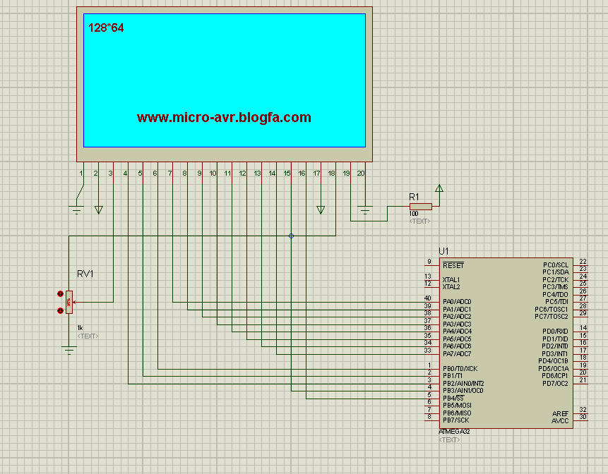 فقط باید این نکته را متذکر شوم که اگر بخواهید این مدار را به صورت عملی ببندید چون شماره های پایه های این lcd که در پروتیوس هست با پایه های یک lcdگرافیکی ts128*64 متفاوت هست باید مدار را طبق نقشه زیر ببندید .که این نقشه نیز در فایل پروتیوس به نام test همراه این فایل ها هست.