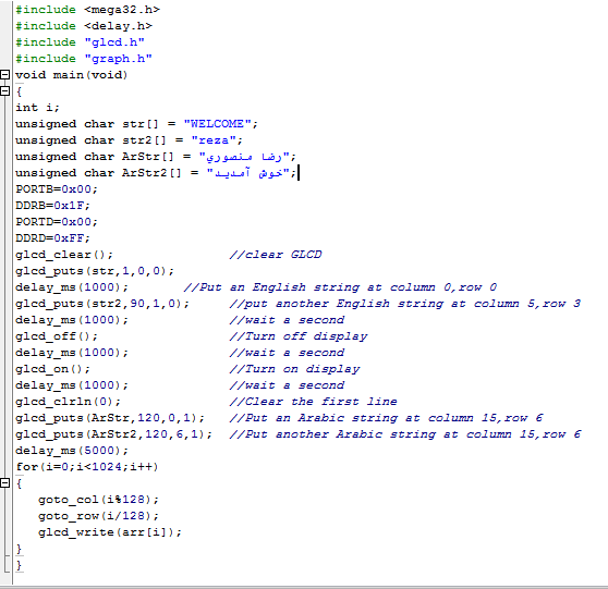 با این دستور glcd_puts(str,1,0,0 متغییر رشته ای str که مساوی بود با welcome در نقطه 0 افقی و 1 عمودی نوشته میشود و صفر دوم به دلیل این که نوشته لاتین هست میگزاریم اگر نوشته فارسی بود باید آن را مساوی با یک قرار دهیم یعنی بجای صفر میشد یک.