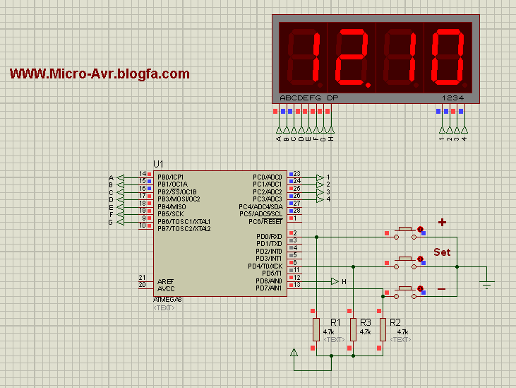 برای تنظیم ساعت یک بار کلید set را فشار میدهید مشاهده میکنید که نقطه سون سگمنت اول از سمت چپ روشن میشود >یعنی ساعت select شد و شما با فشردن کلید (+ مثبت) عدد ساعت را افزایش میدهید
